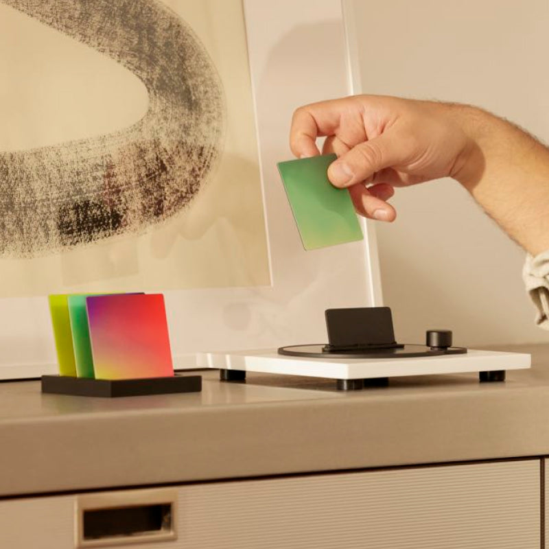Jeder MoodBlock enthält eine Playlist, ein Album oder einen Sender. Tippen Sie ihn auf Ihrem Telefon oder MoodPlay-Gerät an, und die Musik wird sofort auf Ihren Sonos-Lautsprechern abgespielt. Es ist wie das Auflegen einer Schallplatte, nur einfacher!